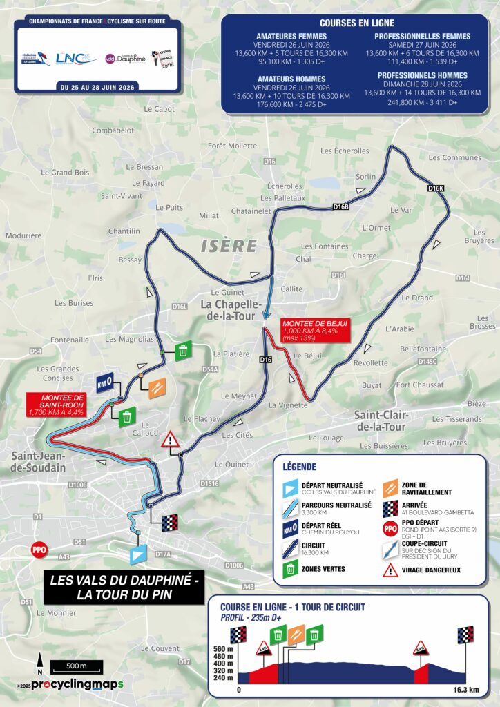 Disputée sur un circuit de 16,3 km à parcourir à 14 reprises, précédé d’une boucle initiale de 13,6 km (soit 241,8 km / 3 411 m D+), cette épreuve nationale UCI CN propose un tracé exigeant et usant. Le parcours est structuré par deux principales difficultés : la montée de Saint-Roch (1,7 km à 4,4 %) et surtout la montée de Beauj (1 km à 8,4 %), qui rythme chaque tour. La répétition des efforts et le dénivelé cumulé favorisent les coureurs complets, capables d’encaisser l’usure et de répéter les intensités.